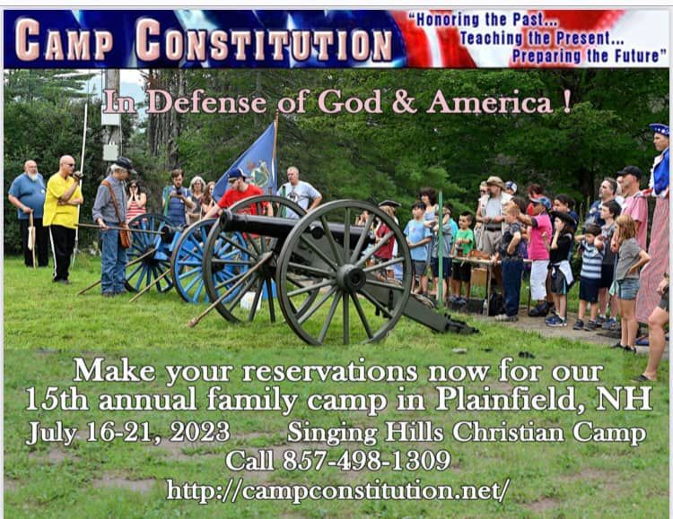 | Camp Constitution will hold its 15th Annual Family Camp at the Singing Hills Christian Camp https://www.singinghills.net/ Plainfield, NH. from Sunday July 16 to Friday July 21, 2023Returning instructors include Pastor David Whitney of the Institute on the Constitution; Professor Willie Soon, world renowned astrophysicist and climate realist; Catherine White of The Constitution Decoded; Alex Newman, author and host of the Sentinel Report, and Rev. Steve Craft, Camp Constitution’s chaplain. First time instructors include NH State Rep Valerie McDonnell, the youngest elected official in the United States, and author Vincent Ellison. Mrs. Edith Craft returns to direct the program for the Junior Campers.